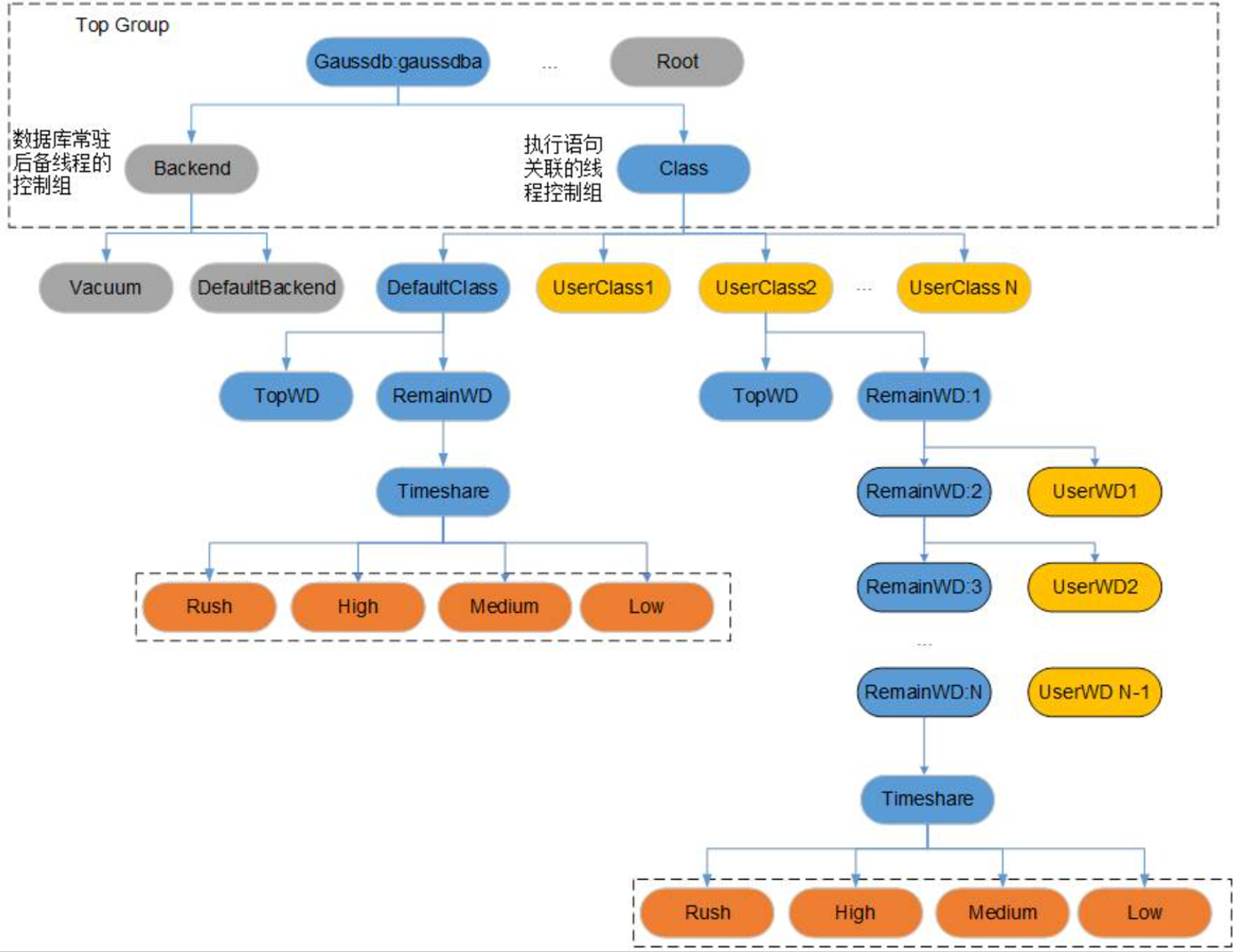 每个数据库集群系统在操作系统Cgroup上均含有单一的目录“Gaussdb:user”,其子目录包含该数据库集群管辖的所有程序(线程)。尤其在大数据平台上,通过控制数据库程序使用的资源,可防止数据库程序对其他应用的影响。