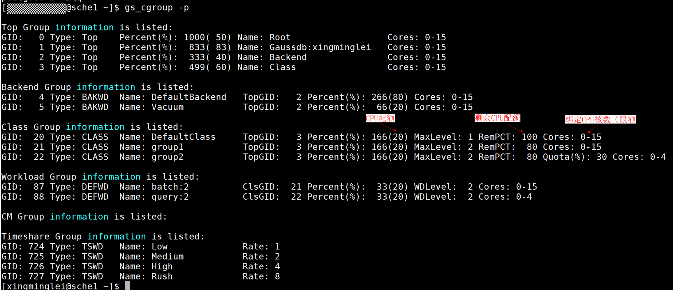 gs_ssh -c "gs_cgroup -c -S group1" (创建第一个控制组group1,可以加-s 40 指定配置40%配额, 没有-s参数时默认配置20%cpu资源)