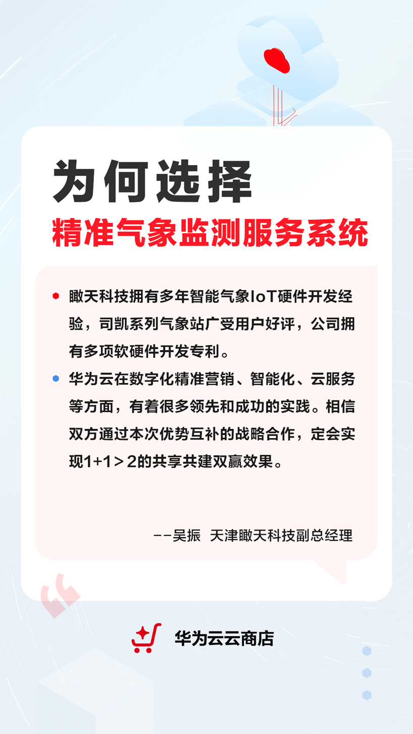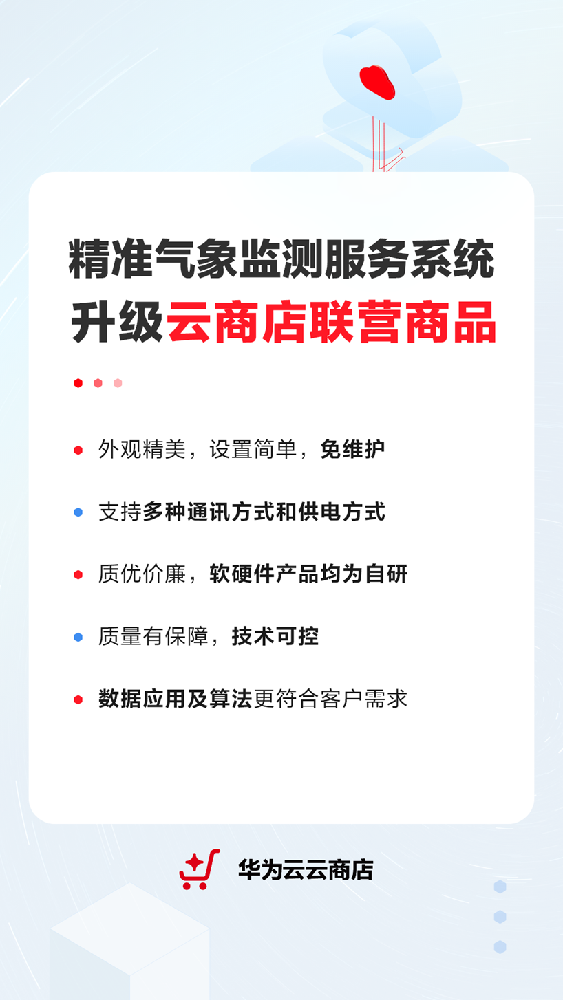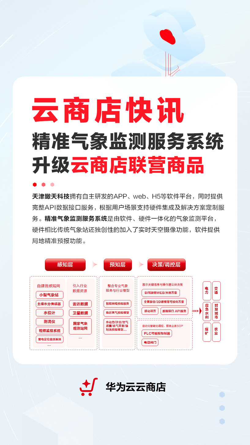近期,瞰天科技的精准气象监测服务系统升级华为云云商店联营商品
