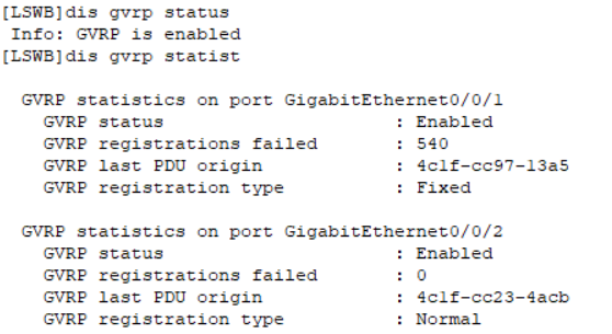[LSWB-GigabitEthernet0/0/1]gvrp registration fixed