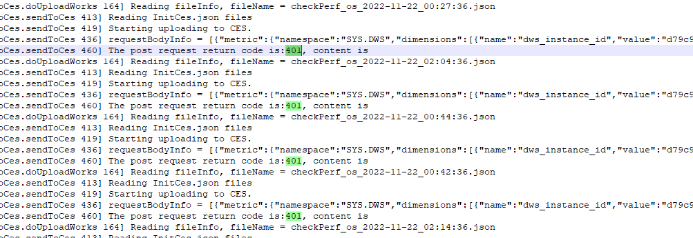 1、登录节点查询ces.log日志(/home/Ruby/log/ces/ces.log)中出现The post request return code is:401, content is(问题节点)