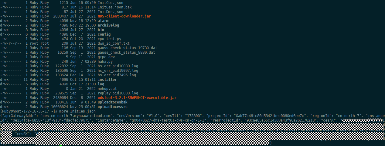 3、复制无问题节点的InitCes.json(/home/Ruby/InitCes.json)文件中的AK/SK,替换问题节点的相同文件的AK/SK,再次查看ces.log出现状态200即正常.