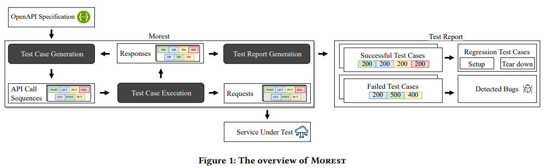 图1显示了Morest的概述。一般来说,Morest包含三个组件:测试用例生成、测试用例执行和测试报告生成。Morest的输入一般是被测服务的符合OpenAPI规范的接口定义文档,输出是包含回归测试用例和分类故障以进行调试的测试报告。