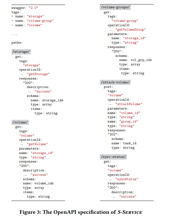例如,在图 3 中,操作 getVolume 以参数 storage_id 作为输入,它是操作 getStorage 的输出。这表明 getVolume 依赖于 getStorage。 Morest 通过参数推断 [4] 提取此类依赖关系。由于 Morest 依赖 OpenAPI 规范作为唯一输入,因此 OpenAPI 规范的质量至关重要。