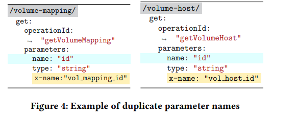 由于 Morest 依赖参数名称来推断 RESTful API 之间的依赖关系,因此重复的参数名称会带来混乱。如图 4 所示,getVolumeMapping 和 getVolumeHost 都需要输入id。