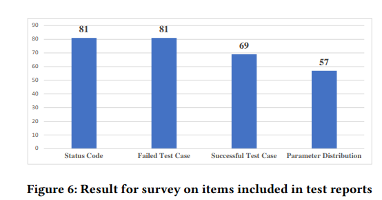 图 6 显示了开发人员最想要的四个属性。特别是,所有开发人员都要求提供状态代码和失败的测试用例,以定位其 RESTful API 服务背后的故障。超过一半的开发人员(85.2% = 69 / 81)希望包含成功的测试用例,可以用作回归测试用例。此外,大量开发人员 (70.4% = 57 / 81) 关心参数分布(n向组合覆盖率)以评估特定轮次测试是否足够。