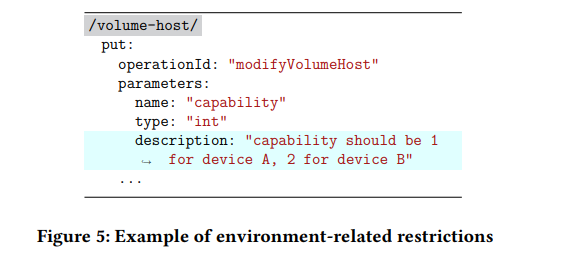 被测服务在不同的生产环境中可能表现不同。具体来说,连接到不同设备的生产环境可能会对API参数产生不同的限制。例如,在图5中,capability的值受生产环境的连接设备数量的限制。如果capability的值无效,相关的测试用例也会失效。为了填补RESTful API规范和生产环境需求之间的空白,我们建议为每个生产环境单独生成一个规范。