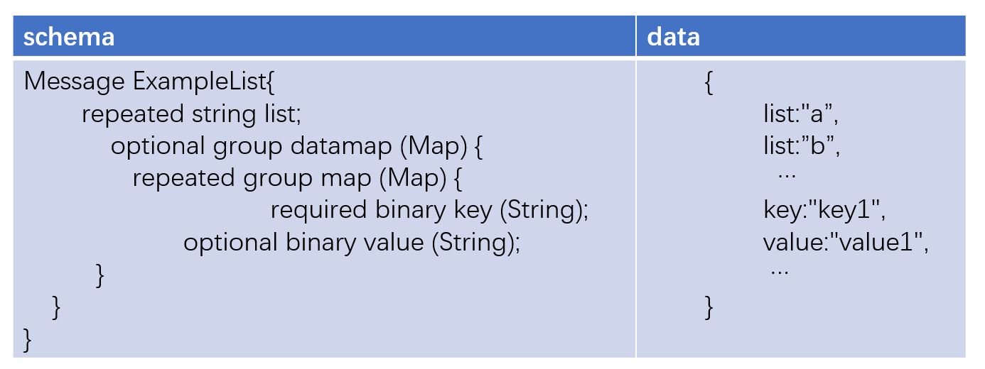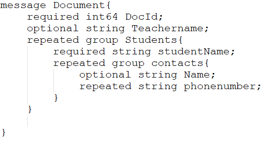 Parquet 采用了一个类似 Google Protobuf 的协议来描述存储数据的 schema。如下是 Parquet 数据 schema 的简单示例: