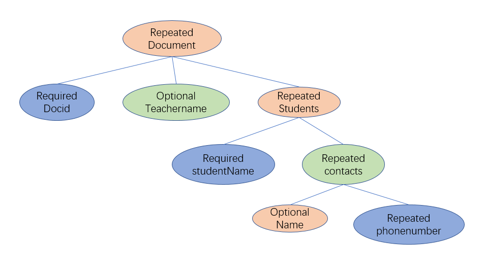 schema 的最上层是 message,里面可以包含一系列字段。其内部每个字段包含三部分:字段类型、数据类型、字段名称。每个字段都拥有 3 个属性:重复性 (repetition)、类型(type)以及名称(name)。字段类型可以是一个 group 或者原子类型 (如 int、boolean、string 等),group 可以用来表示数据的嵌套结构。通过数据类型group来表达层级关系时,将字段类型分为三种,来表达空或数组的概念。