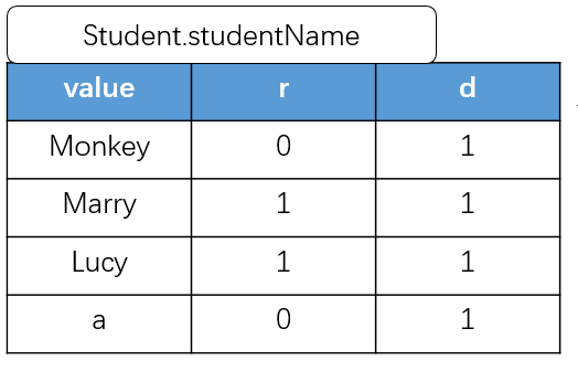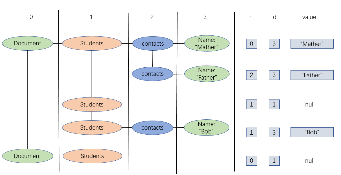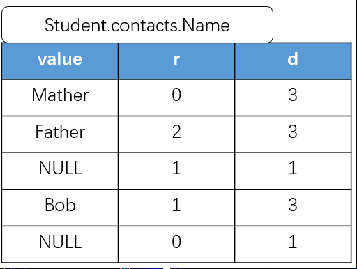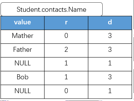 对于Student.studentName这一列,在r1中第一条出现的记录为'Monkey',并且为required属性,因此value1='Monkey',r=0,d为当前定义深度减1,因此d=1;value2='Marry',和上一个值value1在Student这一层是不相同的,换句话说,由于Student的重复导致value的重复,所以R=1,d=1;value3='Lucy',和上一个值value2在Student这一层是不相同的,所以R=1,d=1。r2中该列只有一个值value=’a‘,R=0,D=1。