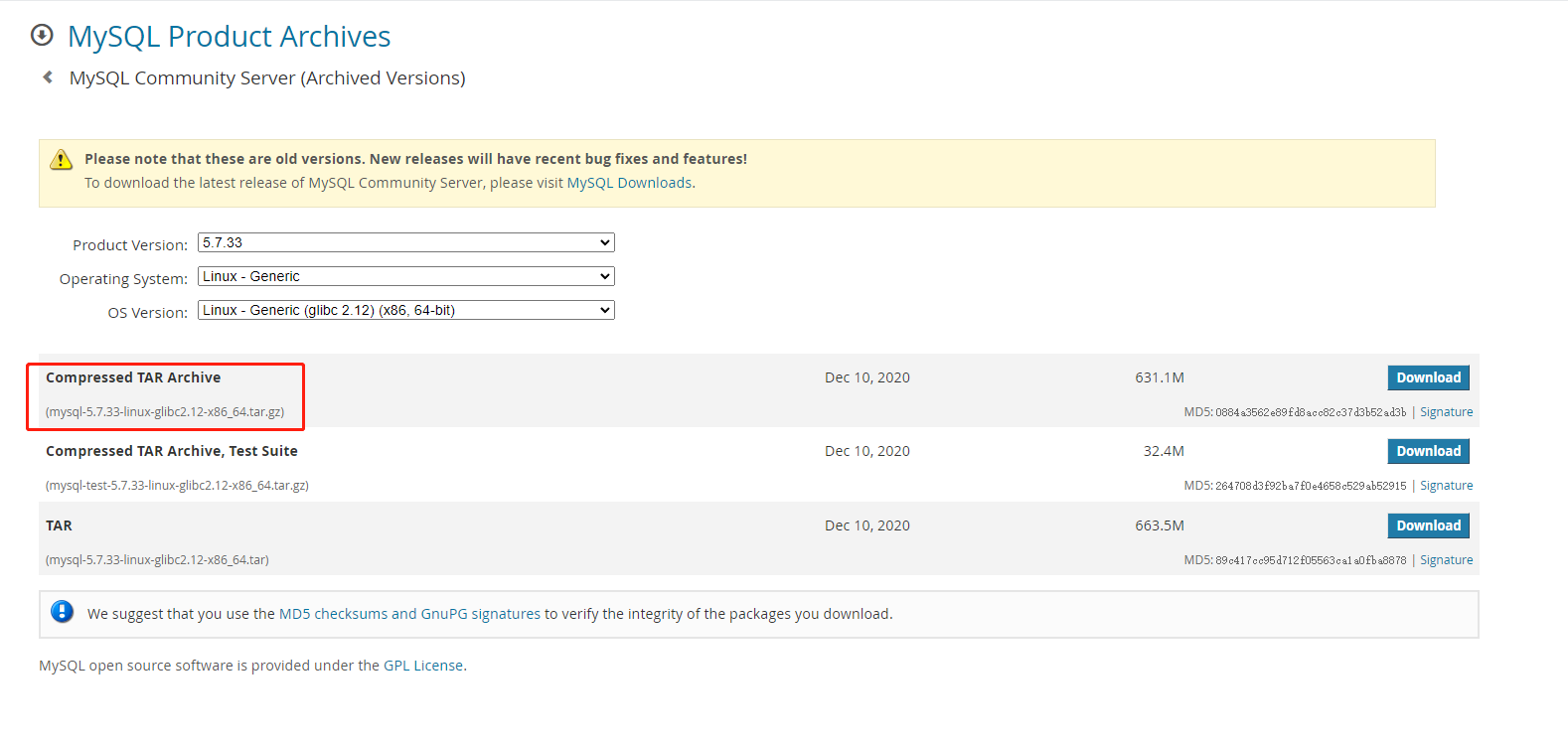 下载mysql5.7解压版,我下载的版本mysql-5.7.33-linux-glibc2.12-x86_64.tar.gz