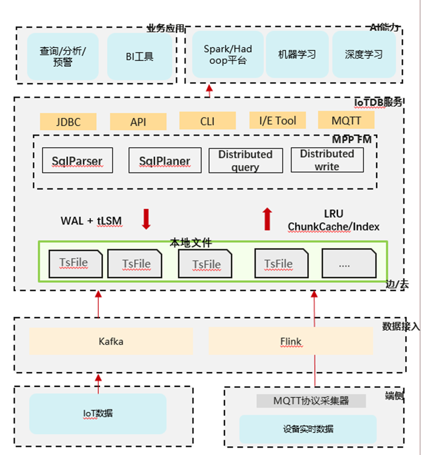 Apache IoTDB提供了高性能的读写,高可靠性,多生态能力。如图所示,为IoTDB整理架构图,通常数据有两种来源,一种是来自设备通过IoT Edge SDK 使用物联网MQTT协议直接写入到IoTDB中;另外一种是其他数据中心的数据采集后使用Kafka或者Flink经过计算或者过滤,然后写入到IoTDB。上层业务可以通过JDBC/API等多种访问接口进行分析和预警,以及对接Grafana可视化界面。同时大数据和人工智能平台可以利用API接口直接分析Tsfile文件,也可以通过jdbc方式读取数据进行分析。