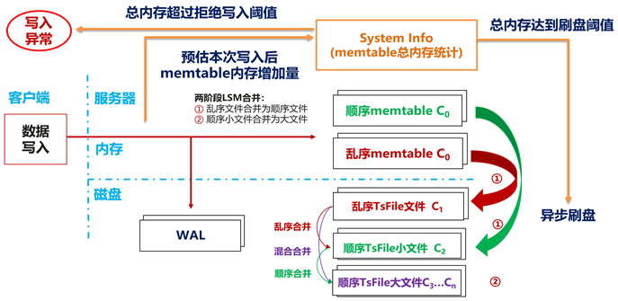 写入速度快: 如图1-2所示,在LSM-Tree的基础上,引入了tLSM算法。此算法将乱序数据和顺序数据进行隔离,互不影响,加速了顺序数据的WAL和Memtable落盘到tsfile中。使用单独的线程定期将乱序数据合并到顺序tsfile中,重建tsfile索引,保证整个Tsfile数据集是有序,并且在Tsfile中使用chunk index和Bloom Filter,这样在写入快的同时不影响查询速度。此算法在国际数据库顶级会议ICDE 2022已发表。