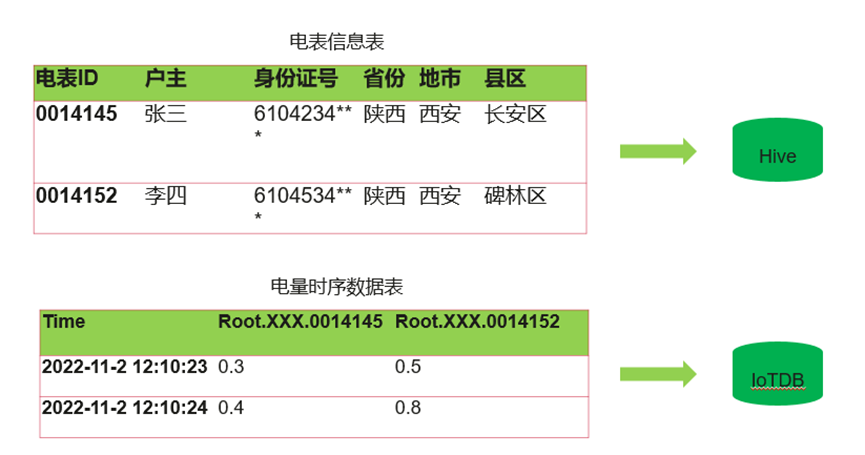 某电力公司将电表采集的时序数据保存在IoTDB中,将电表的位置信息保存在了Hive中,数据库表如下: