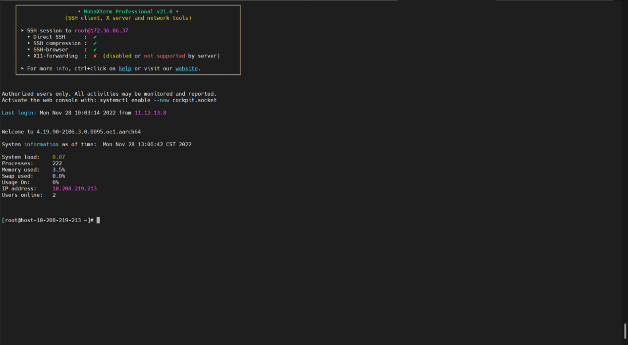 a. 使用MobaXterm工具,以root用户登录服务器。