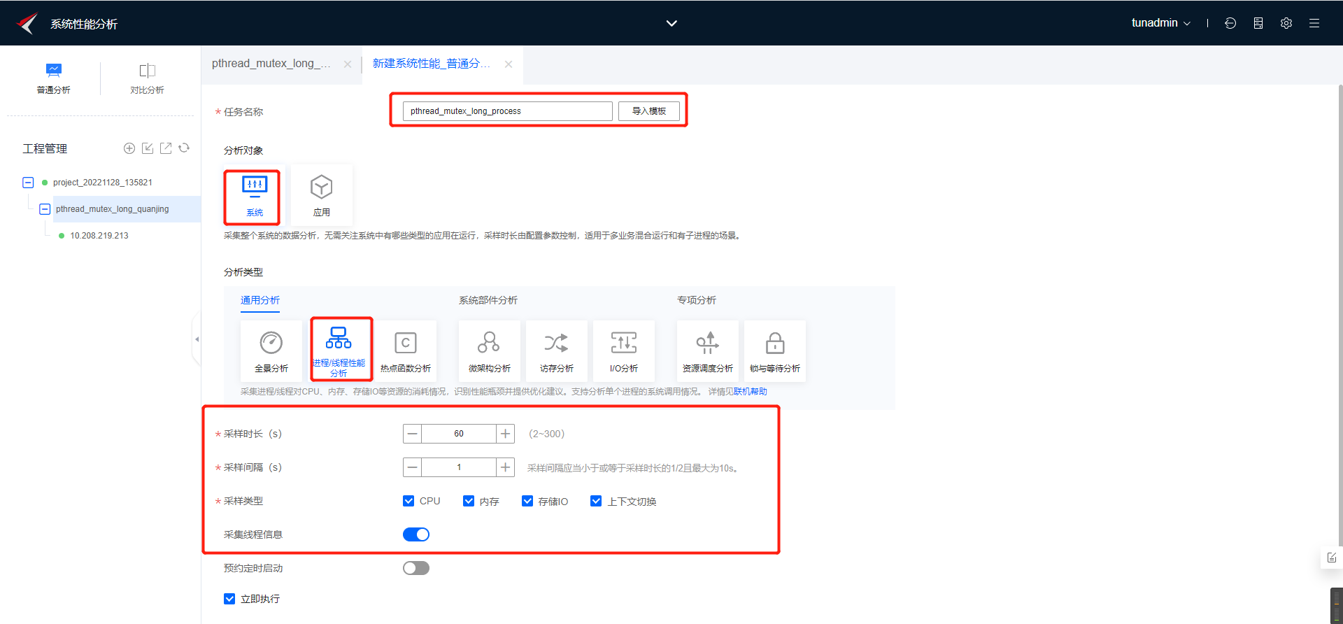 a. 创建进程/线程分析任务,并启动分析,具体配置如下图。