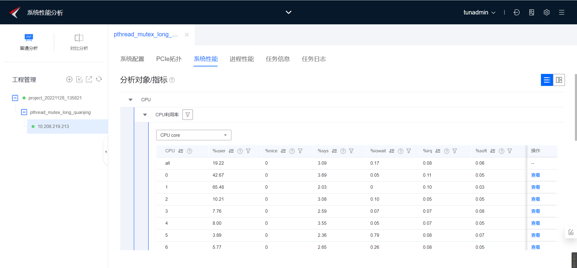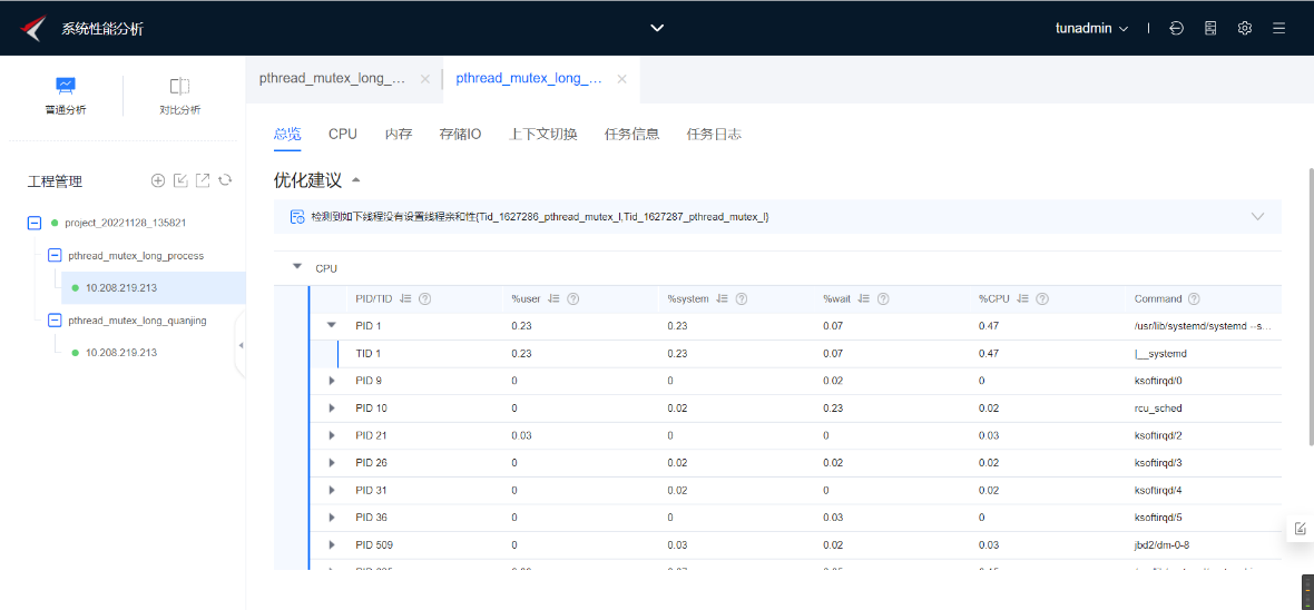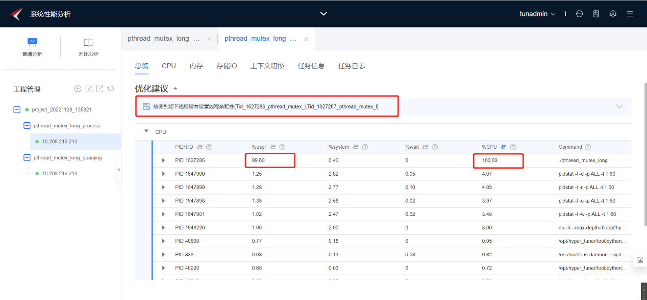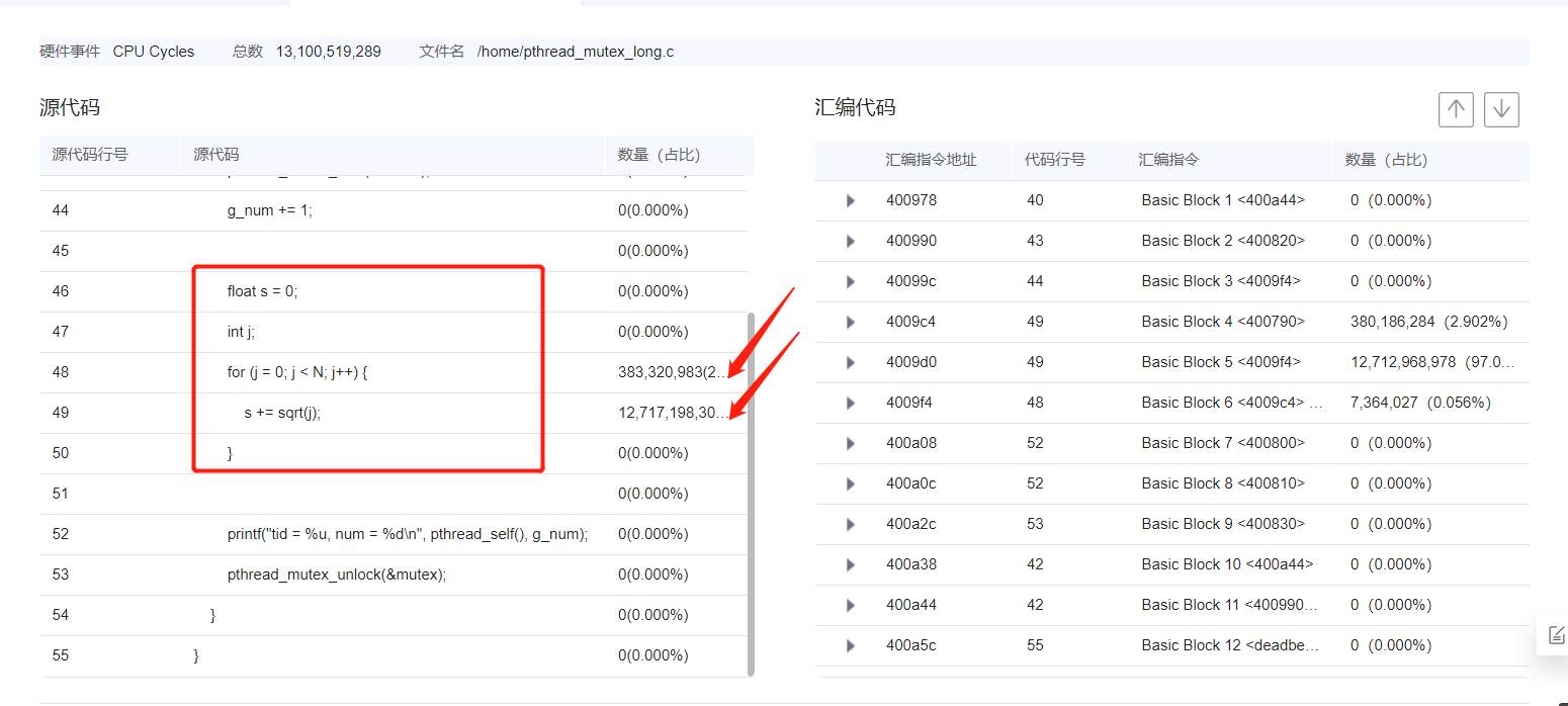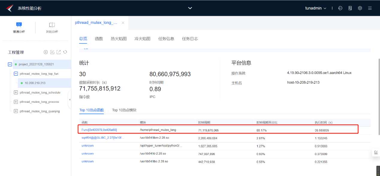 如下图所示为热点函数分析任务结果-总览。我们可以看到这个模块/home/pthread_mutex_long的时钟周期百分比在88%以上,符合我们的预期。