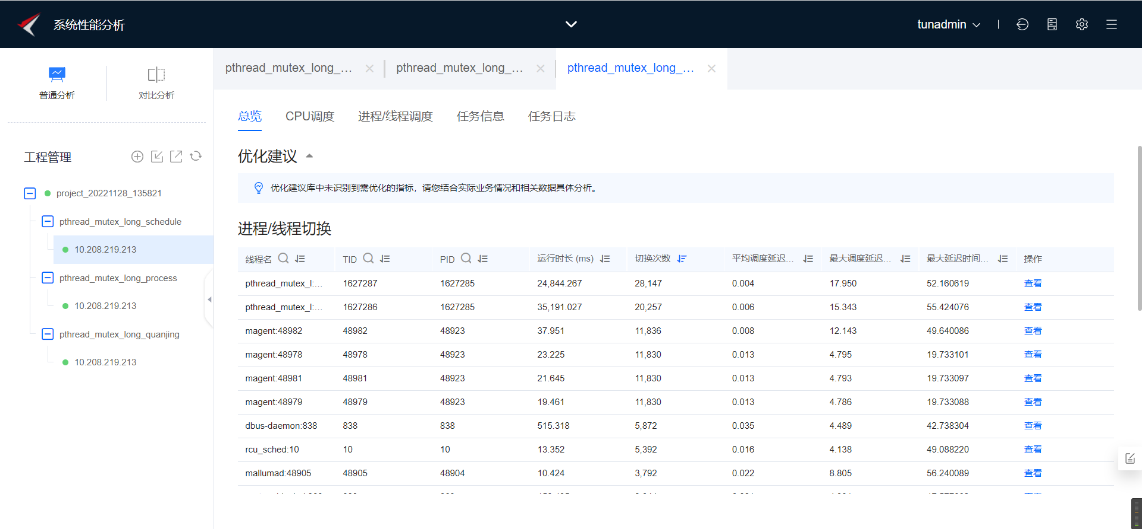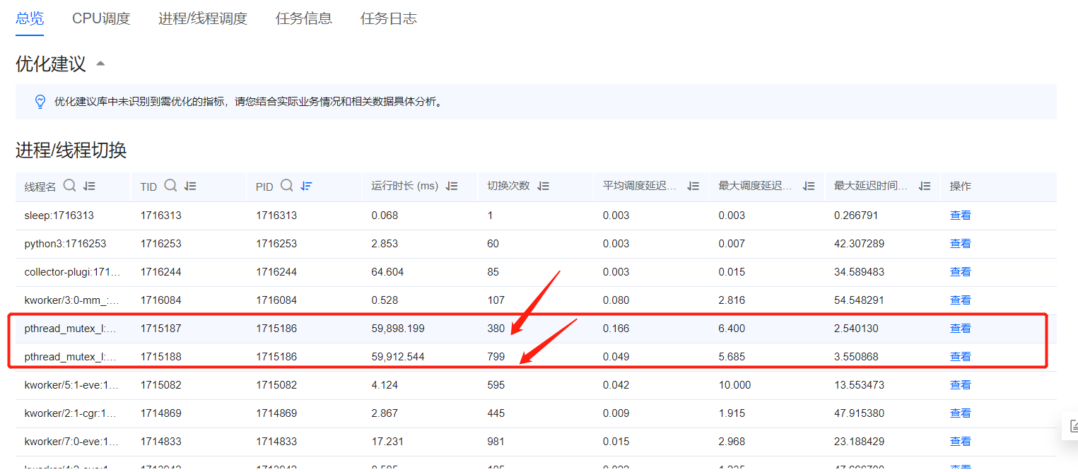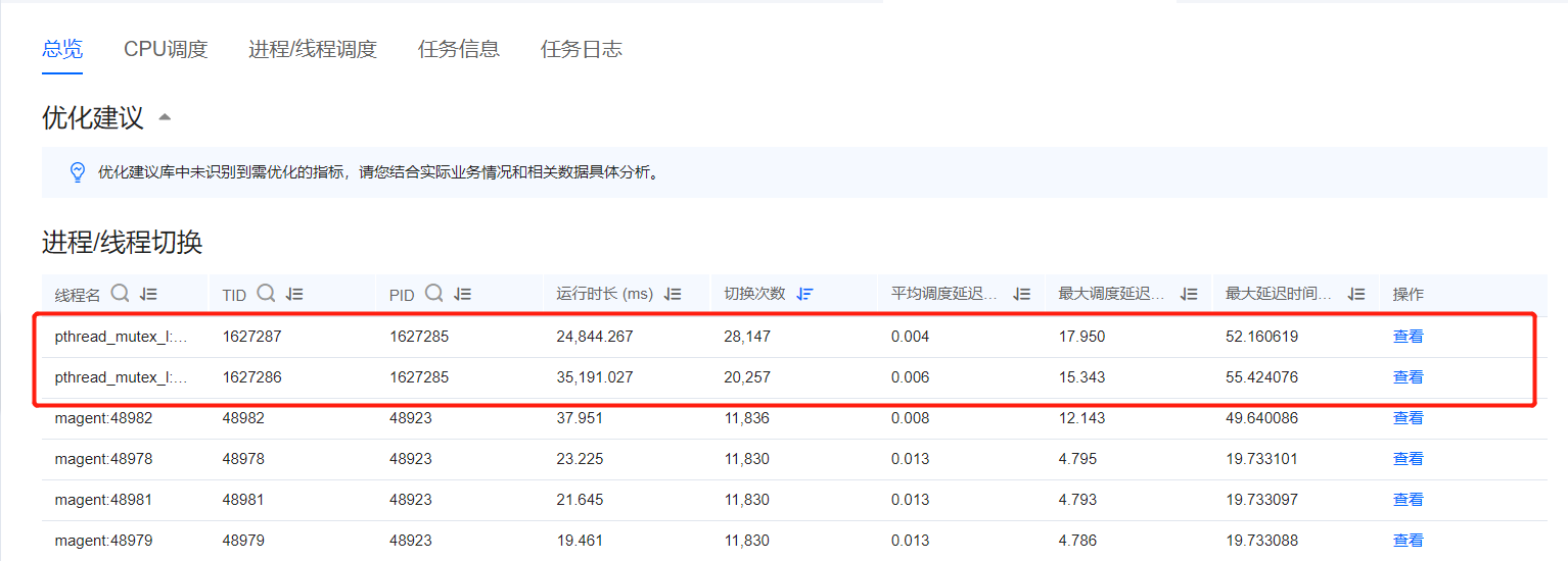 查看分析结果,在“总览”页签中,点击线程名、PID或者TID旁边的过滤按钮,可以选择pthread_mutex_l,可以发现切换次数相较优化前大幅减少。如下图所