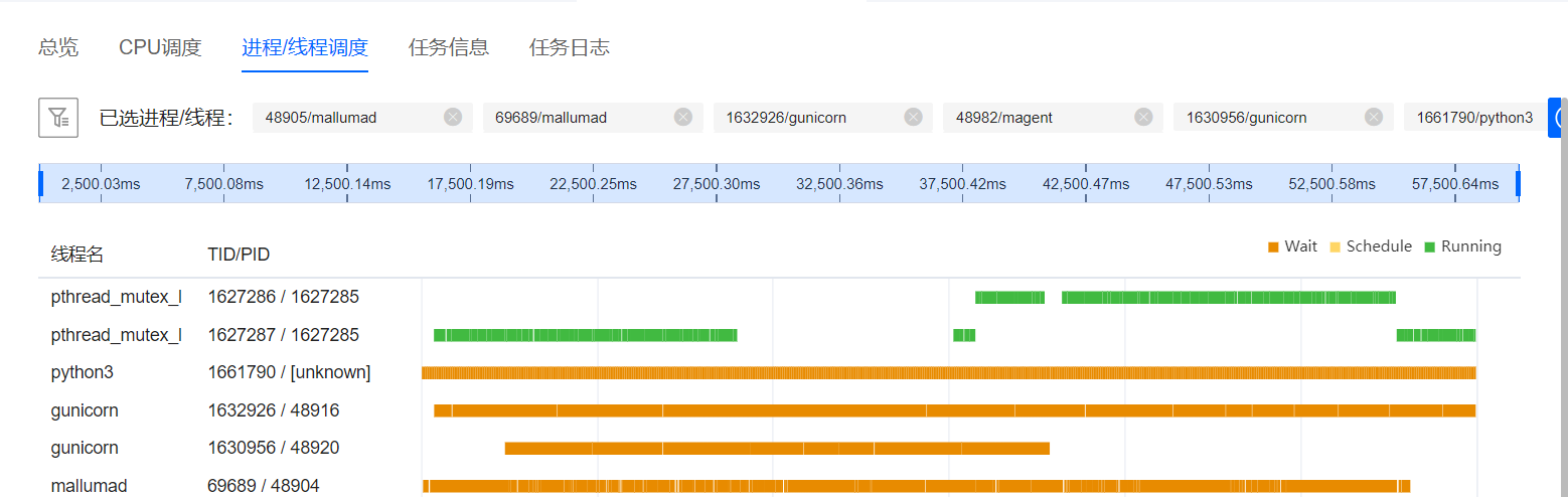 在“进程/线程调度”页签中,可以看到pthread_mutex_l两个线程之间情况。如下图所示,可以看出,此时,两个线程切换时等待时间很短(橙色部分),这段时间用于计算需要互斥的全局变量,除此之外,两个线程可以并发运行不需要互斥操作的计算(绿色部分),大幅度提升了计算性能。