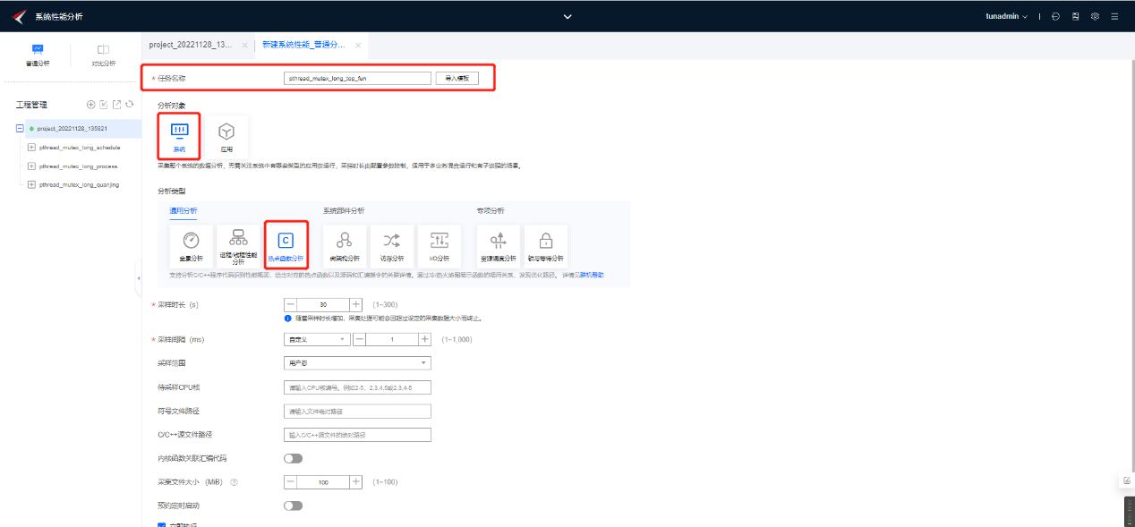 a.创建热点函数分析任务,并启动分析。