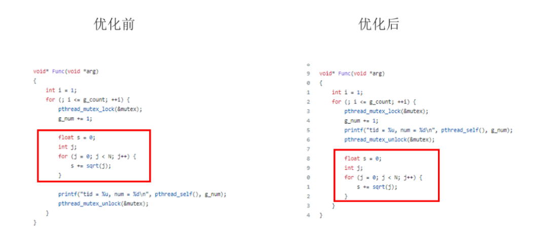 下面开始优化代码,将不需要互斥的操作移到pthread_mutex_unlock()之后。优化前后对比如下图所示。