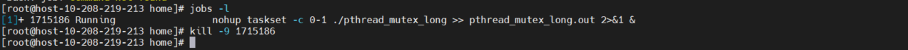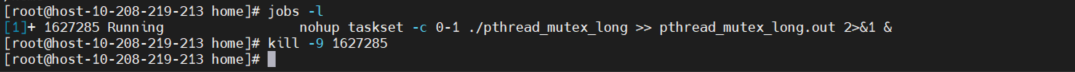 通过jobs -l查看pthread_mutex_long_mod程序运行pid(如果程序尚未结束,可以看到后台运行的程序),通过kill -9结束进程。具体命令如下: