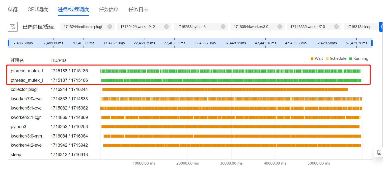 在“进程/线程调度”的页签中,可以看到pthread_mutex_l两个线程之间情况。绿色代表当前线程处于运行状态,橙色代表当前线程处于等待状态,观察可以发现pthread_mutex_l两个进程之间存在一个线程长期占用(绿色部分)而另一个线程长期等待状态(橙色部分),而没有平衡的相互交替运行(橙色绿色在两个线程中的长度相等)。如下图所示。将鼠标或者使用触摸板放在调度图上,滑动鼠标滚轮,可以放大、缩小图片,可以更清楚地看到等待运行的分布情况。
