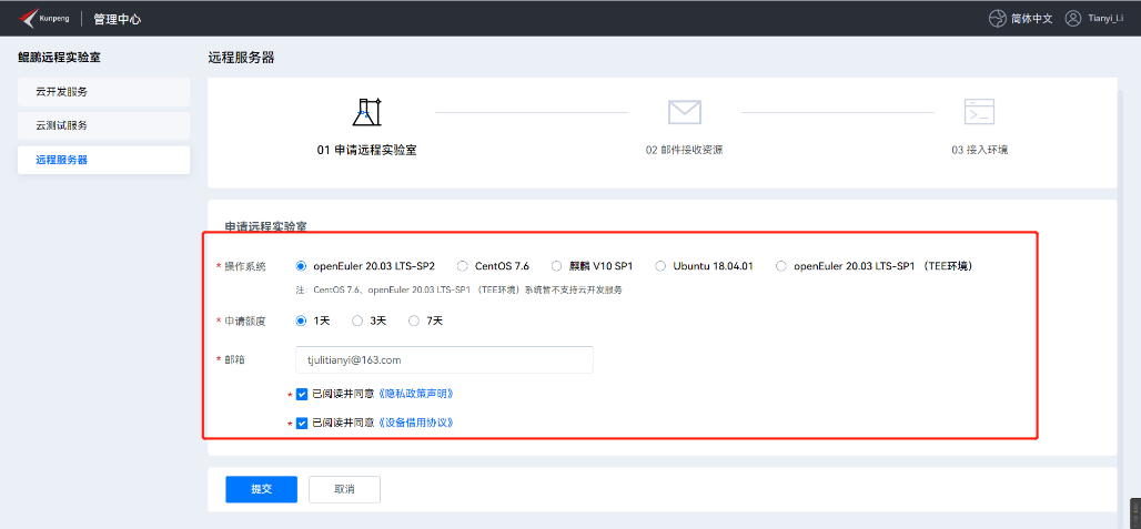 2)在鲲鹏社区申请远程实验室,操作系统选择OpenEuler。