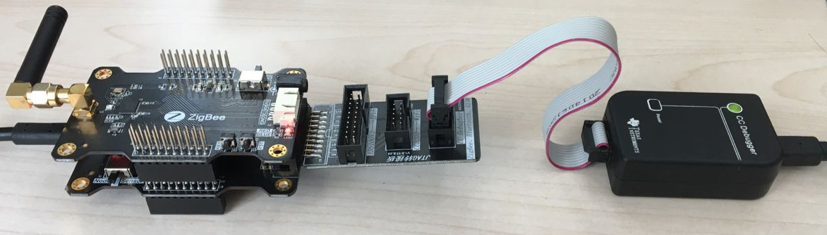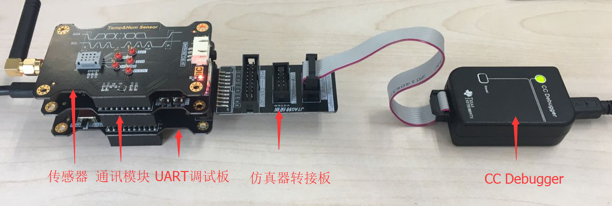 1)将CC Debugger仿真器、温湿度传感器、ZigBee通讯模块、UART调试板、仿真器转接板按照下图方式连接(图片中传感器仅供参考)。