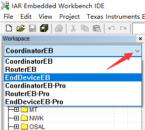 注意:本工程需要编译两次,一次编译为协调器,一次编译为终端,通过在Workspace中工程选择单元来选择不同的源码,当选择为CoordinatorEB时为协调器,当选择为EndDevices时为终端,如下图: