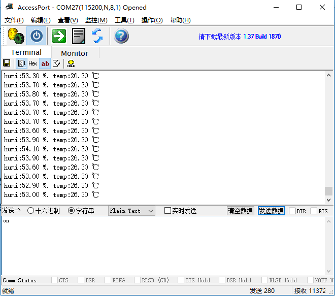 依次烧写协调器和终端节点,当协调器组建网络成功过后RED灯保持常亮,终端节点加入网络过后RED灯常亮(若网络未连接则RED灯闪烁),打开串口调试软件,配置串口参数连接到协调器的端口,此时串口终端显示温湿度传感器的值,如下图: