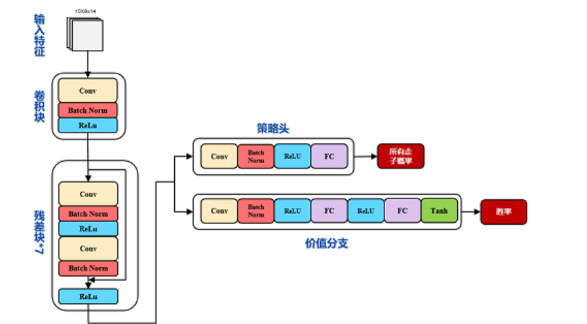 这里基于Resnet实现了AlphaZero中的神经网络,神经网络输入为当前象棋棋面转化得到的0-1图,大小为[10, 9, 14],[10, 9]表示象棋棋盘大小,[14]每一个plane对应一类棋子,我方7类(兵、炮、车、马、相、仕、将),敌方7类,共14个plane。经过Resnet提取特征后分为两个分支,一个是价值分支,输出当前棋面价值,另一个是策略头,输出神经网络计算得到的动作对应概率。