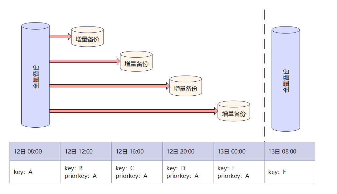 差分增量备份:如果一次全量备份后的多次增量备份,指定的prior-backup-key均为上一次备份(可能是全量备份也可能增量备份)的backup-key,即此次备份是基于上一次备份集来进行的,那么这些增量备份就是差分增量备份,差分增量备份均是基于最近一次备份进行的,如图2所示。