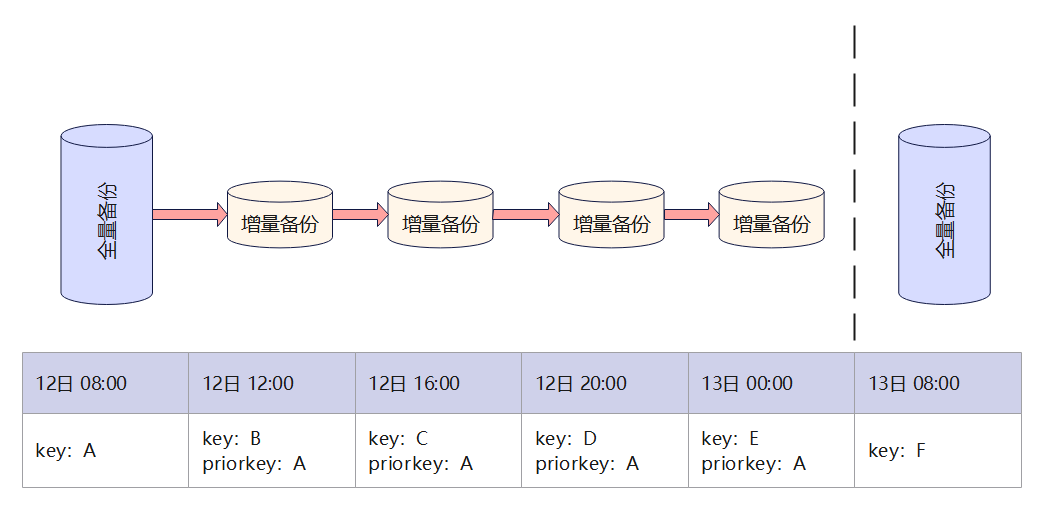 累积增量备份:如果一次全量备份后的多次增量备份,指定的prior-backup-key始终为全量备份的backup-key,即所有的增量备份都是基于全量备份来进行的,那么这些增量备份就是累积增量备份,累积增量备份均是基于最近一次全量备份进行的,如图1所示。
