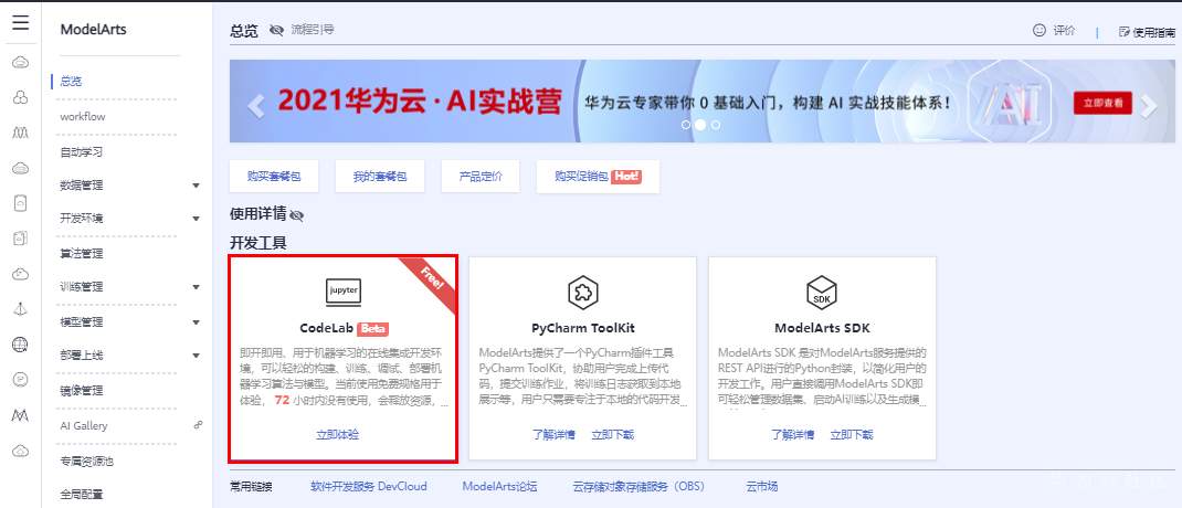 点击此处进入ModelArts界面,再参考下图点击进入CodeLab