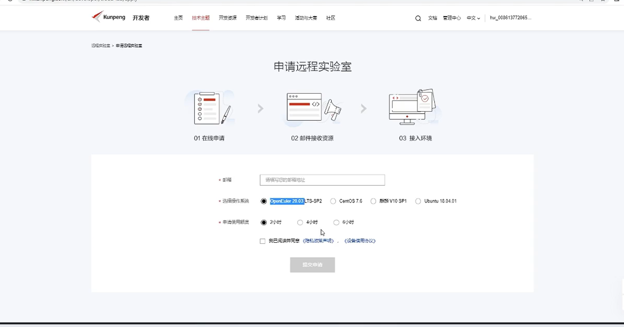 那么我们先退出我们的 PPT 然后第一步就是我们去申请我们的远程服务器,然后来到坤的网站海坤文网站大家进来之后往下翻后到这个远程实验室这边,然后去点击立即申请。这里面会让大家去填入自己的邮箱,然后去学,操作系统推荐大家去用欧朋欧拉,然后申请的额度可以学的时长一点,然后这个时间如果不够用的话,后续也可以做一个续时使用。这里面不要忘记勾上。