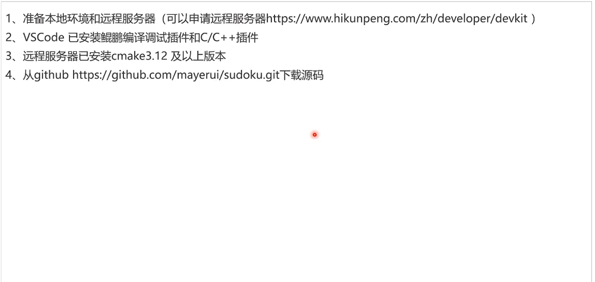 第二点就是准备好本地的一个 IDE 环境,这里我们用的是 VSCode 然后在 vs code 上我们去装一些插件,一个是 C 和 C 加加的一个插件。第二个是我们的控力调试插件准备工作。第三点就是说我们对远程服务器上要去安装我们的 CMake 然后它的一个版本是要求到 3.12 及以上。