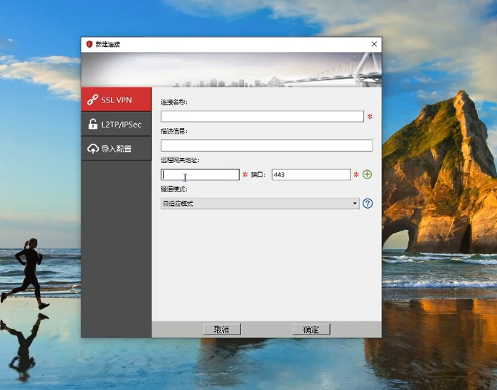 如果大家第一次去连的话,这边一定去选择新建连接。新建连接的时候大家注意,就是这个端口级别在收到的邮件里面基本上是10,001,一定要注意这一点,一定是远程的网关都是这边收到的是大家看那个 VPN 网关幺二三点六零点幺幺四六零,然后端口是10,001,考虑建平城就叫 remote 远程实验室的一个VPN 。这个好了,业绩,那我们去点击连接。好,这边取叠取消用户名也在我们的邮件里面 BC 压线80,然后再是零八七七密码的话是。