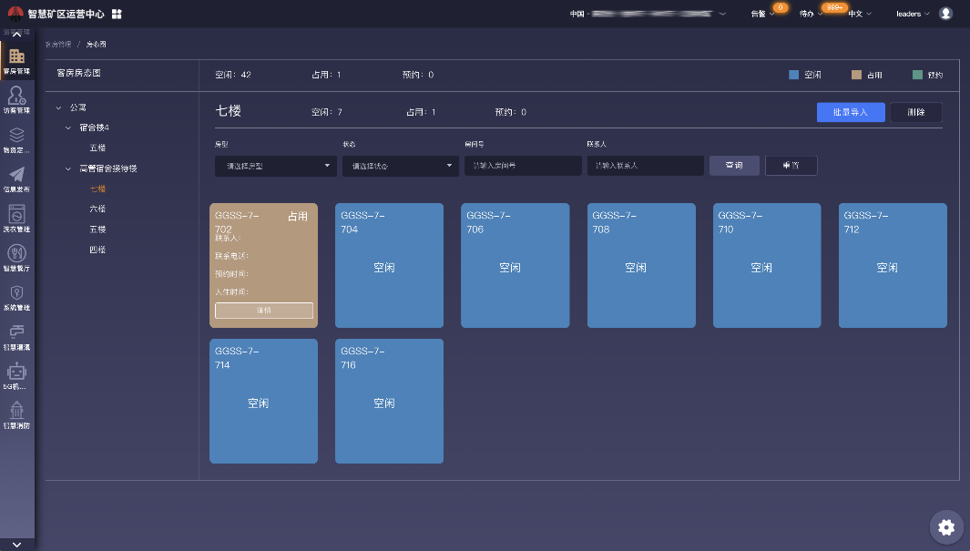 (6) 客房管理:实现客房资源的可视化管控,房间占用状态一图可视,根据入住人要求自动匹配房间。客房的预订、续住、审核、入住、退房进行无纸化、精细化管理,记录客房入住的每个环节数据,严格控制客房管理的各个流程。