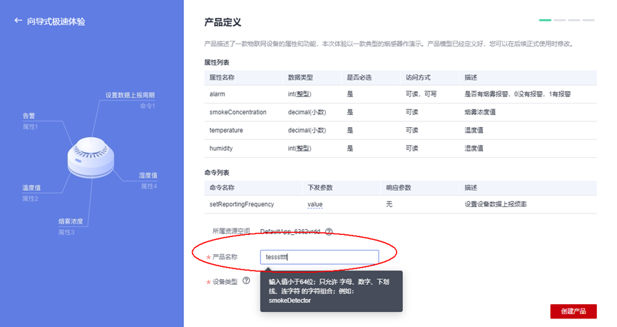 下图“产品名称”处输入自定义字母数字组合,点击右下角“创建产品”进入下一步