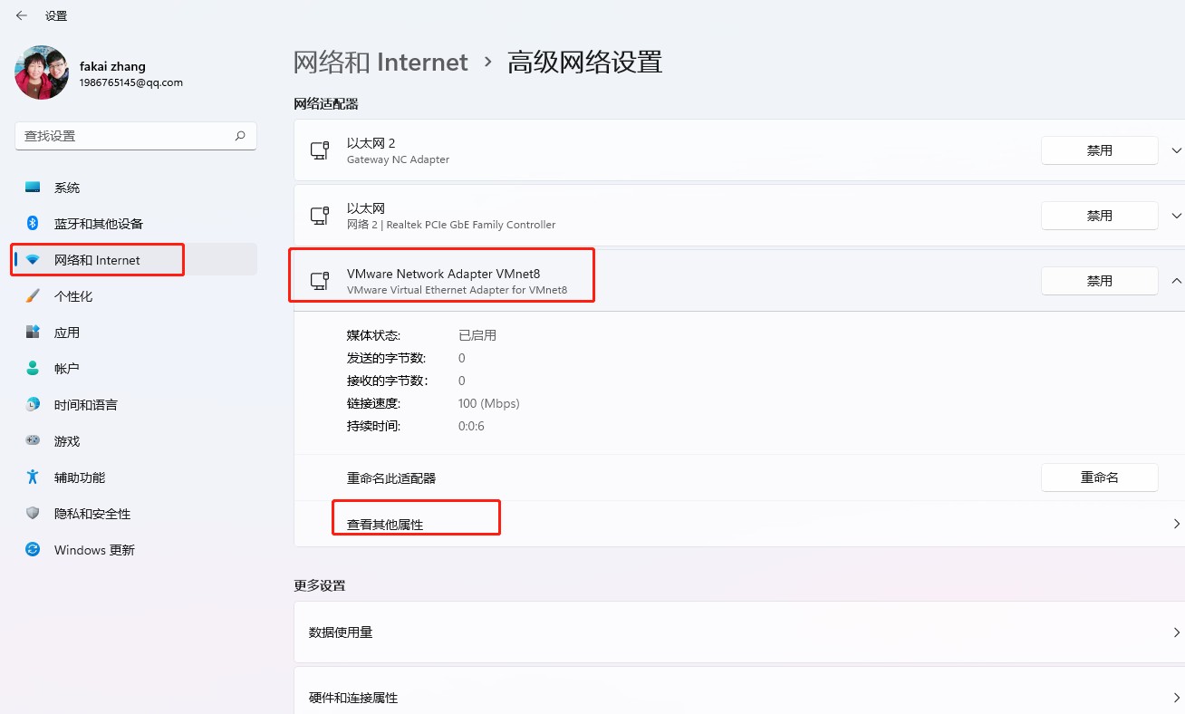 找到网络和internet--->找到对应的虚拟网卡--->查看其他属性