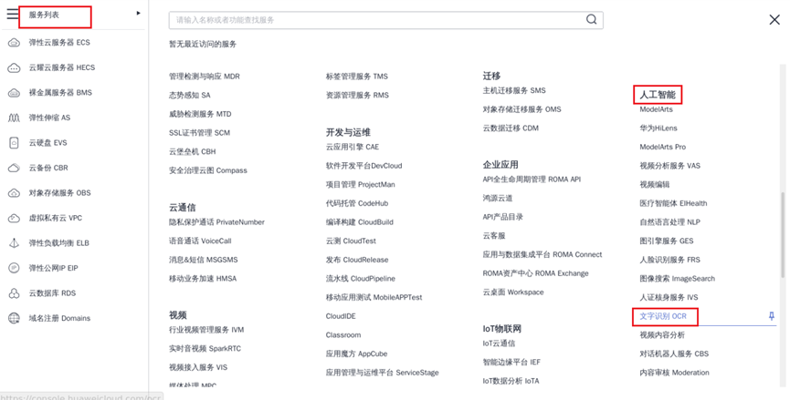 ① 登录后跳转至控制台页面,点击左上角服务列表按钮,下拉找到【人工智能】,在【人工智能】栏下找到【文字识别OCR】,点击进入文字识别OCR服务控制台,如下图: