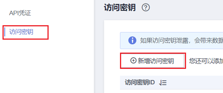 ② 依次点击【访问密钥】、【新增访问密钥】