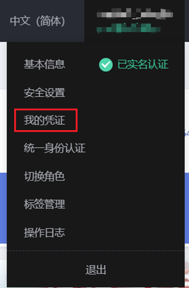 ① 华为云控制台页面右上角账号处点击【我的凭证】