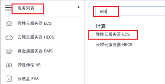 ① 服务列表搜索“ecs”,找到并进入ECS控制台: