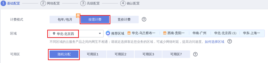 ② 计费模式选择“按需计费”,区域选择“华北-北京四”,可用区选“随机分配”: