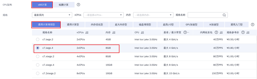 ③ CPU架构选择“x86计算”,规格选择“通用计算增强型”“2vCPUS-8GB内存”:
