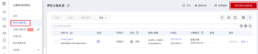 ① 回到ECS控制台“弹性云服务器”标签页,点击“购买弹性云服务器”