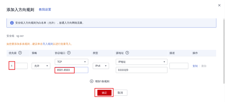 ⑦ 添加入方向端口8501-8503,点击“确定”完成安全组设置。