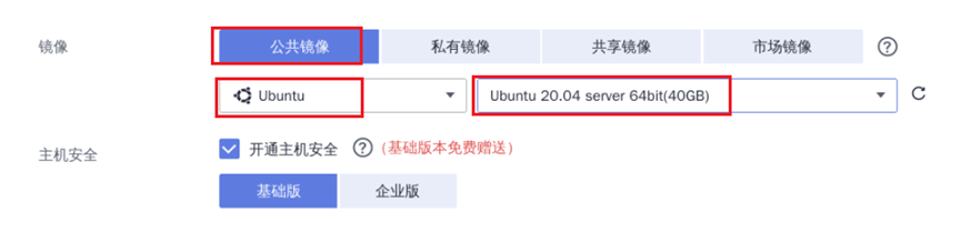 ④ 镜像选择“公共镜像”、“Ubuntu”、“Ubuntu 20.04 server 64bit”,主机安全保持默认配置: